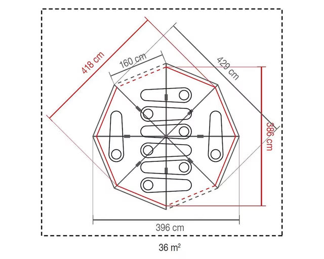 The tent is delivered in a practical transport bag with wheels. The tent fabric is treated with flame retardants, otherwise in PU-coated polyester 2000 mm. The tent floor (PE) is sewn into the rest of the tent. Solid tent poles in steel. Area: 15.7 m2.